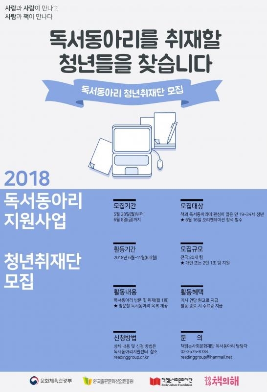 책읽는사회문화재단은 문화체육관광부와 한국출판문화산업진흥원과 함께 지역, 직장 등 생활공간을 기반으로 하는 독서동아리를 발굴하여 책 읽는 문화의 일상화·활성화를 도모하고자 합니다. 올 한해 책읽는사회문화재단과 함께 각 지역에서 독서동아리의 귀한 사례를 취재할 청년들의 신청을 기다립니다.