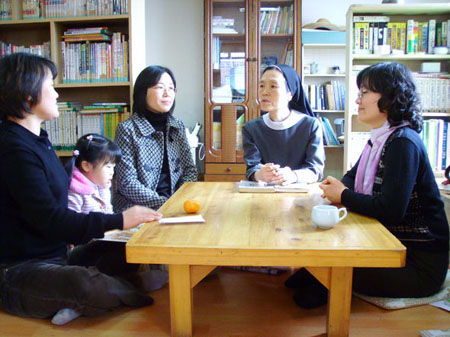 ▶ 성남시 책이랑도서관은 70년대 이 지역 노동자들의 교육공간과 쉼터 구실을 했던 ‘만남의 집’에 자리하고 있다. 그때 여성노동자로 이곳을 찾은 이들은 이제 엄마가 되어 아이들과 함께 도서관을 찾는다. 도서관장 양요순 수녀가 도서관을 찾은 엄마들과 이야기를 나누고 있다.